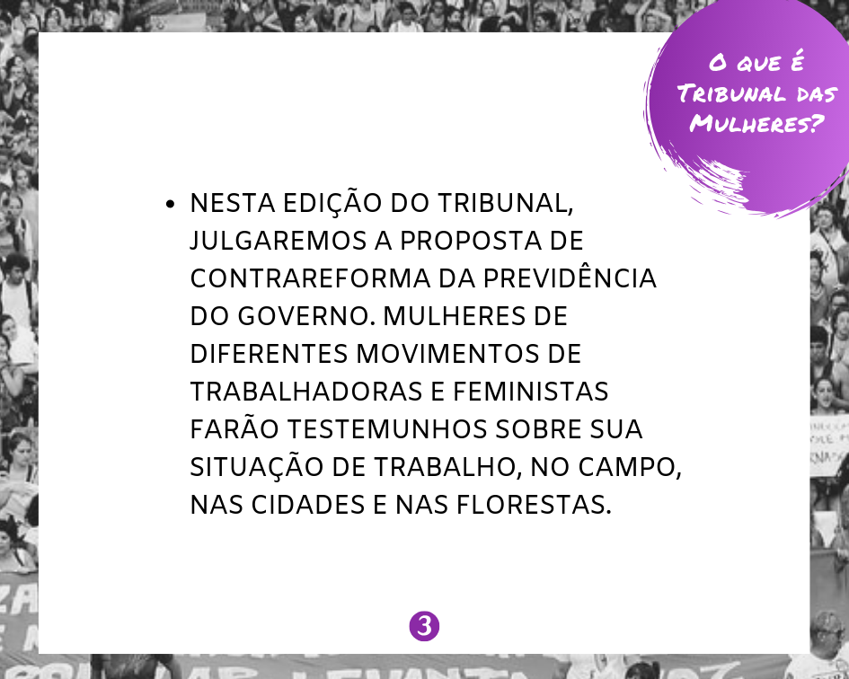 Nesta edição do Tribunal, julgaremos a proposta de ContraReforma da Previdência do governo Bolsonaro. Mulheres de diferentes movimentos de trabalhadoras e feministas farão testemunhos sobre sua situação de trabalho, no campo, nas cidades e nas florestas, e, partindo delas, a proposta da contrareforma será julgada por especialistas de referência na área de seguridade social. As vozes das mulheres, suas experiências de trabalho e resistência, serão a matéria para o julgamento, ético e político, desta proposta de reforma.