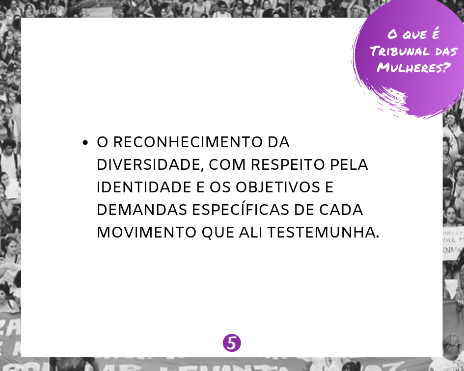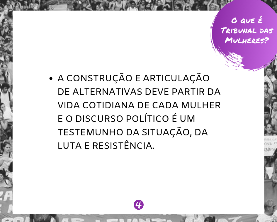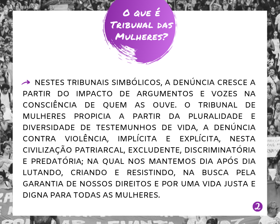 Nestes Tribunais simbólicos, a denúncia cresce a partir do impacto de argumentos e vozes na consciência de quem as ouve. O Tribunal de Mulheres propicia a partir da pluralidade e diversidade de testemunhos de vida, a denúncia contra violência, implícita e explícita, nesta civilização patriarcal, excludente, discriminatória e predatória; na qual nos mantemos dia após dia lutando, criando e resistindo, na busca pela garantia de nossos direitos e por uma vida justa e digna para todas as mulheres.