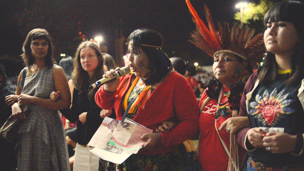 A campanha foi apresentada no Brasil no Fórum por Inara Saterê Maué, ativista da Articulação de Mulheres Brasileiras e relembrou as parentas sobre a conexão intensa entre as mulheres e a terra: “O mundo amazônico é uma mulher!” E questionou os presentes: “Mas como é que a gente tá cuidando das mulheres? Toda vez que uma mulher sofre violência, a Terra tá sendo violentada também”, alertou a indígena. Ela encerrou a apresentação convocando todas a se olharem nos olhos, firmando o conpromisso de engajamento nas mobilizações pela vida das mulheres indígenas, seus corpos territórios e espíritos. No final, todos entoaram a música “A terra é meu corpo, a água é meu sangue, o ar é meu sopro, o fogo é meu espírito”, tocaram a terra e se molharam com a água preparada pela indígena para simbolizar a proteção de todos.