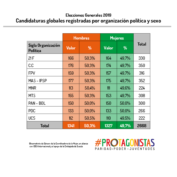 Comenzó la carrera electoral en Bolivia y las mujeres y jóvenes se pusieron la camiseta de #Protagonistas para conquistar mayores espacios de decisión en las Elecciones Nacionales 2019 y Elecciones Subnacionales 2020, en las que se renovarán las autoridades ejecutivas y legislativas para los próximos cinco años. El movimiento feminista exige que se respete la paridad en las listas de candidaturas y que se promueva una mayor participación de las juventudes.