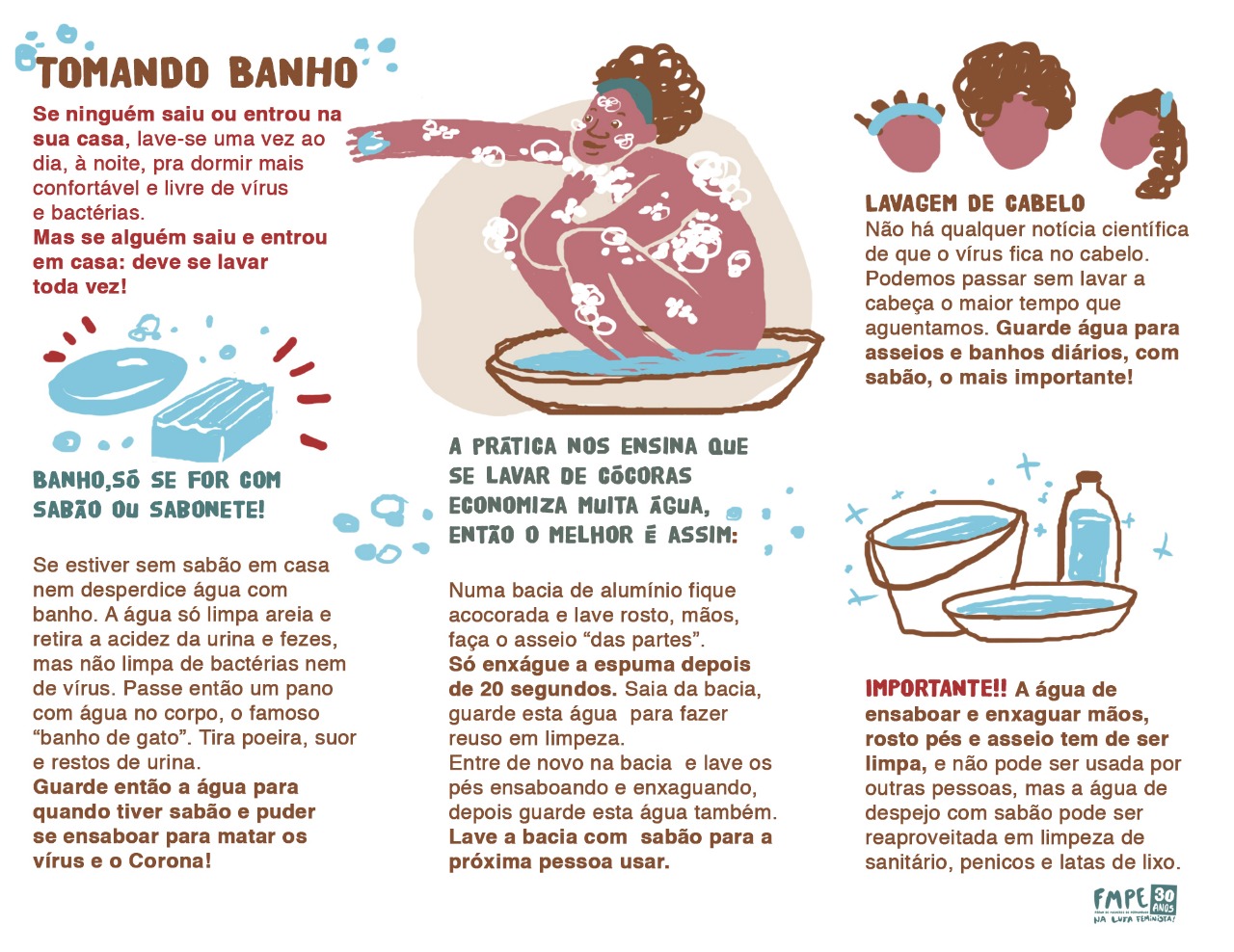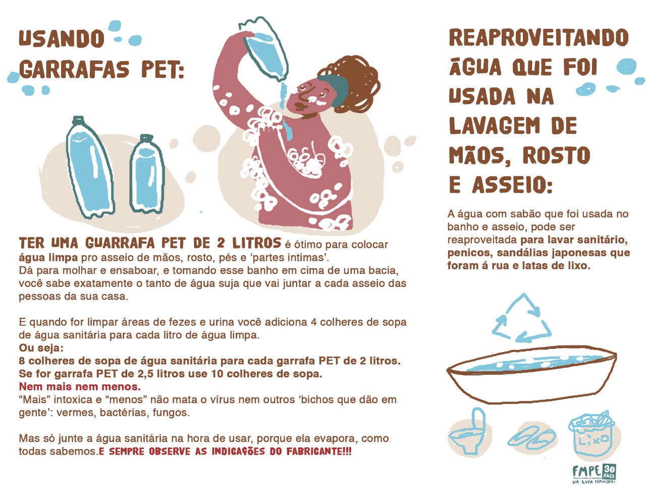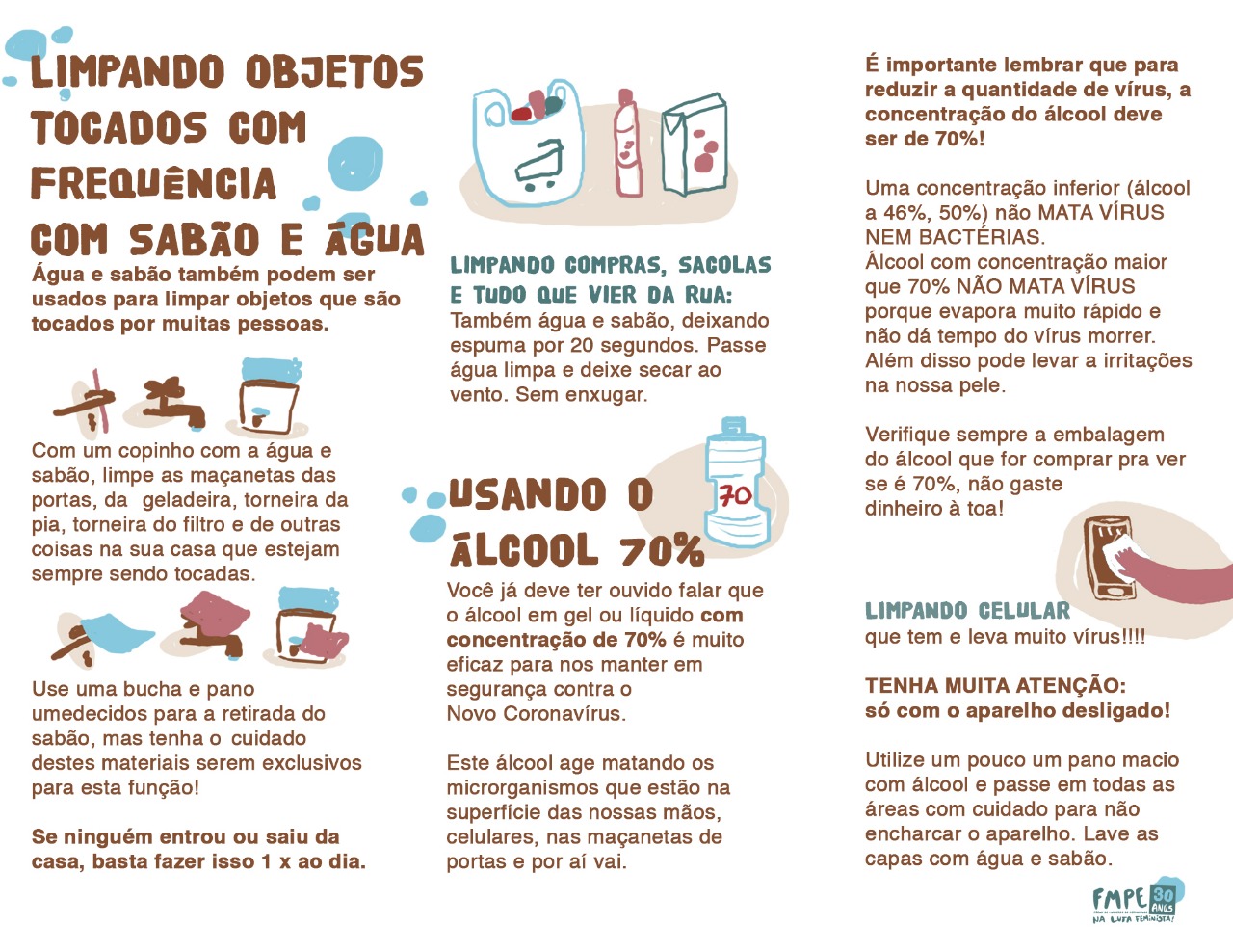 A rede de solidariedade do FMPE, tem produzido materiais pedagógicos e informativos que estão sendo distribuídos através do whatsapp, redes sociais e por rádios comunitárias, como o “Manual Econômico de Higiene: Como Prevenir a Covid-19 com Pouca Água e pouco Dinheiro?”. O material foi fruto de pesquisa e produção das coletiva de saúde e de comunicação do Fórum e traz informações importantes que mostram como as mulheres e suas famílias podem se proteger. A preocupação do FMPE tem sido produzir informação que ajude a proteger a vida e evidenciar os problemas causados pela falta de projeto político de democratização e acesso aos serviços públicos.
