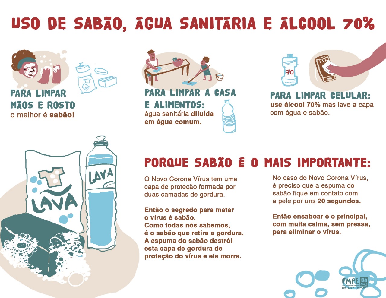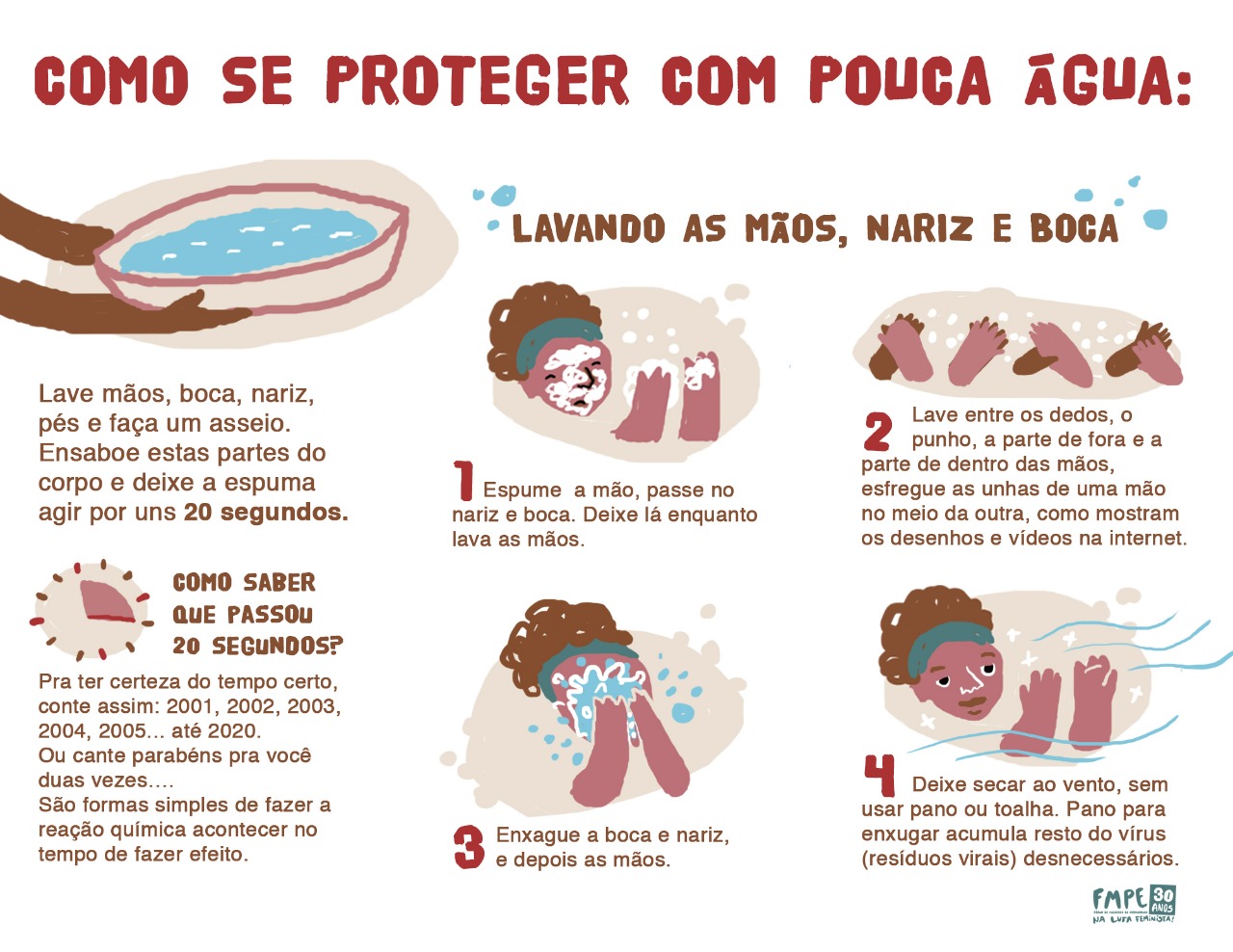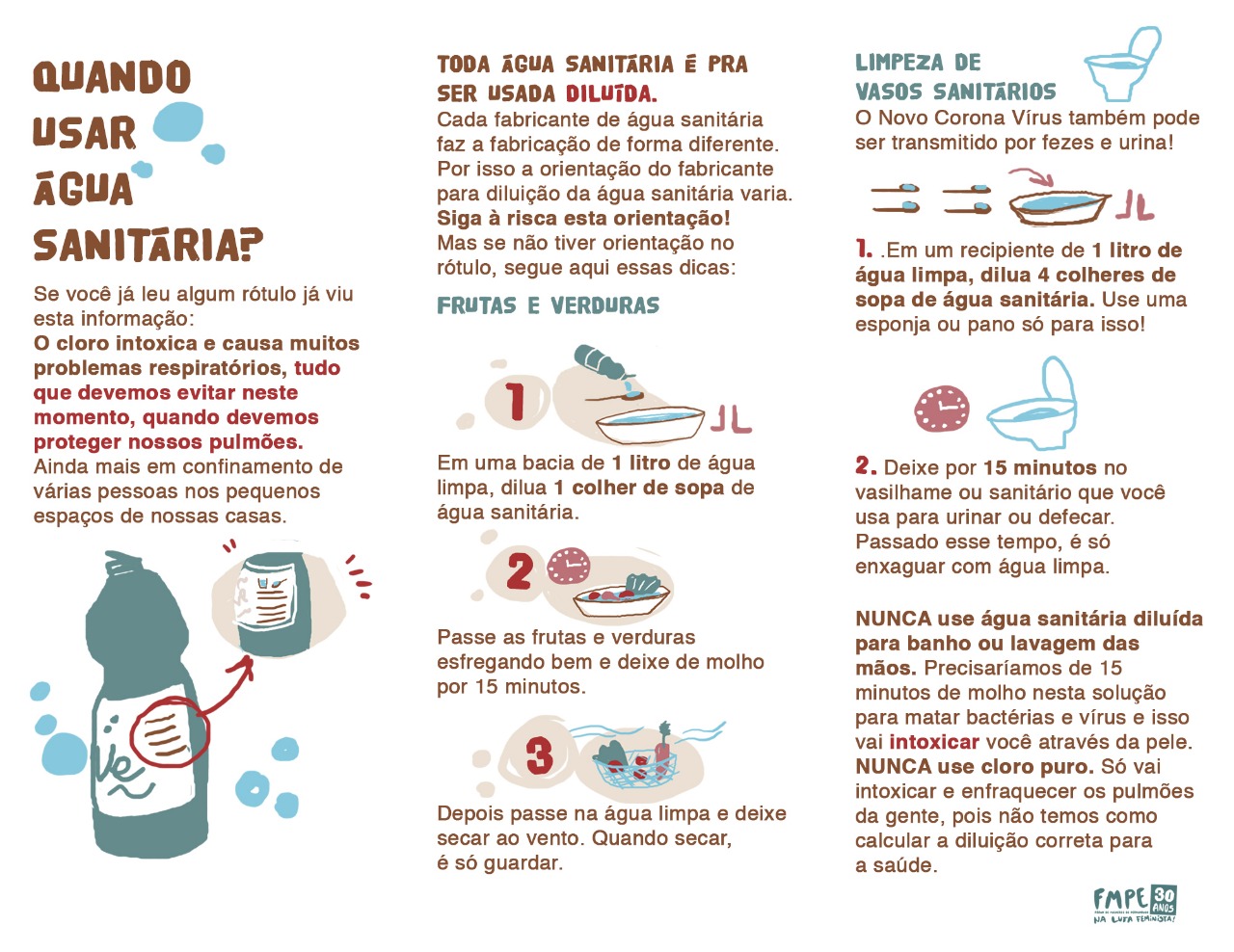 A rede de solidariedade do FMPE, tem produzido materiais pedagógicos e informativos que estão sendo distribuídos através do whatsapp, redes sociais e por rádios comunitárias, como o “Manual Econômico de Higiene: Como Prevenir a Covid-19 com Pouca Água e pouco Dinheiro?”. O material foi fruto de pesquisa e produção das coletiva de saúde e de comunicação do Fórum e traz informações importantes que mostram como as mulheres e suas famílias podem se proteger. A preocupação do FMPE tem sido produzir informação que ajude a proteger a vida e evidenciar os problemas causados pela falta de projeto político de democratização e acesso aos serviços públicos.