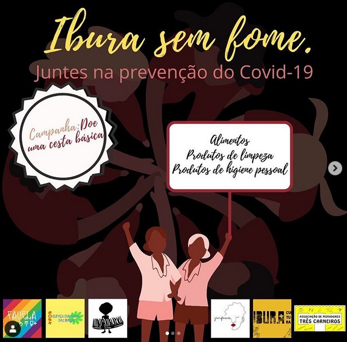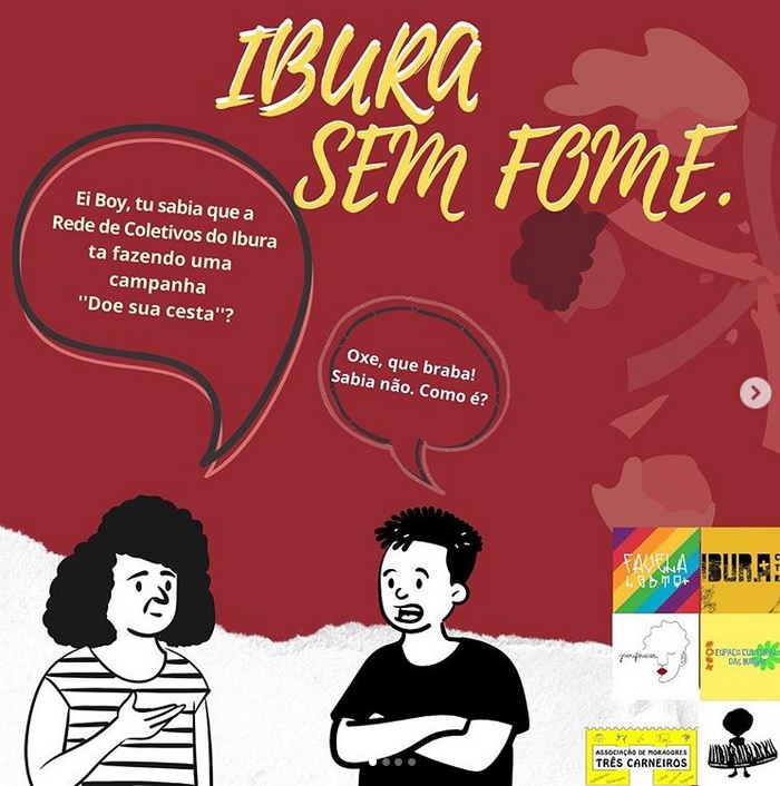 Com o marasmo do governo Bolsonaro em implementar de forma célere o pagamento da Renda Básica Emergencial, a Rede de Coletivos do Ibura tem tocado a campanha “Ibura Sem Fome”, para arrecadar alimentos, materiais de limpeza e higiene para serem distribuídos junto a moradores do bairro e de comunidades próximas. As ações em rede de solidariedade estão sendo organizados pelas Coletiva Periféricas, Favela LGBTQ+, Espaço Cultural das Marias, Ibura mais Cultura, Ibura Black e a Associação dos Moradores Três Carneiros.