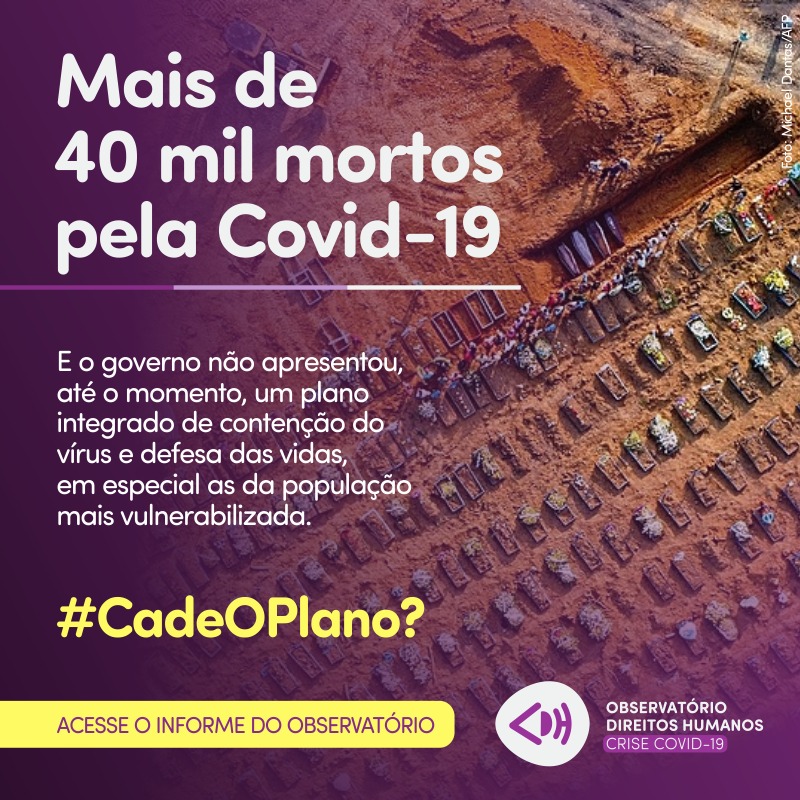 O Observatório dos Direitos Humanos na Crise da Covid-19 é uma ação de um conjunto de organizações sociais e movimentos populares, de um espectro diverso dos direitos humanos, para monitorar, formular e sistematizar informações relativas aos direitos humanos no contexto da pandemia de coronavírus.
