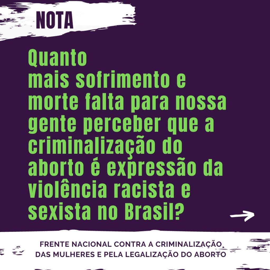 Em nota, a Frente Nacional Conta a Criminalização das Mulheres e pela Legalização do Aborto pergunta: quanto mais sofrimento e morte falta para nossa gente perceber que a criminalização do aborto é expressão da violência racista e sexista no Brasil?