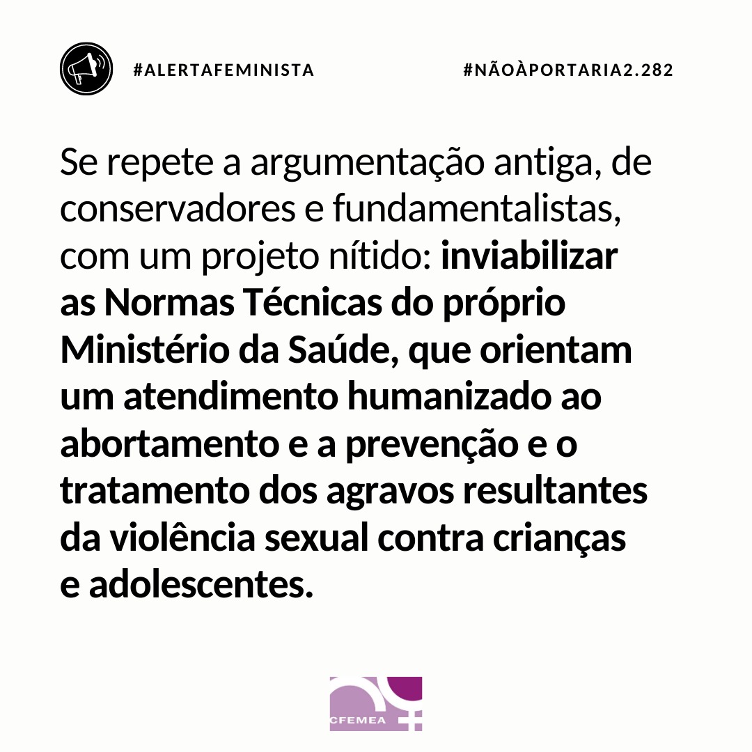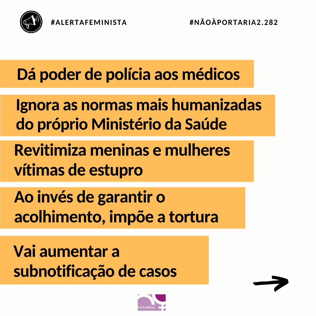 Na prática a portaria inviabiliza o atendimento das mulheres e meninas vítimas de violência sexual nos serviços de saúde, ao exigir: notificação da autoridade policial pelo médico com preservação de evidências; parecer técnico médico; aprovação de uma equipe de saúde multiprofissional; dentre outros procedimentos.