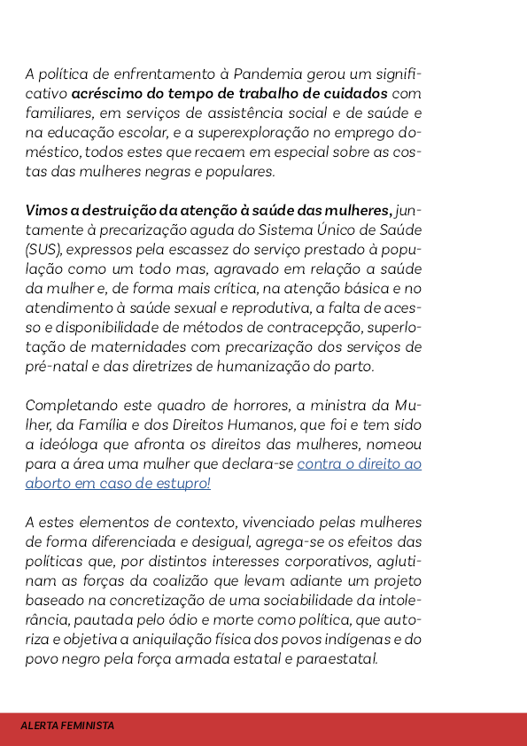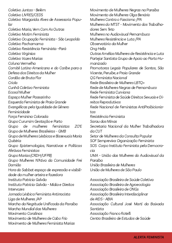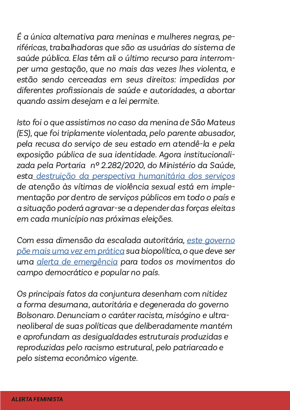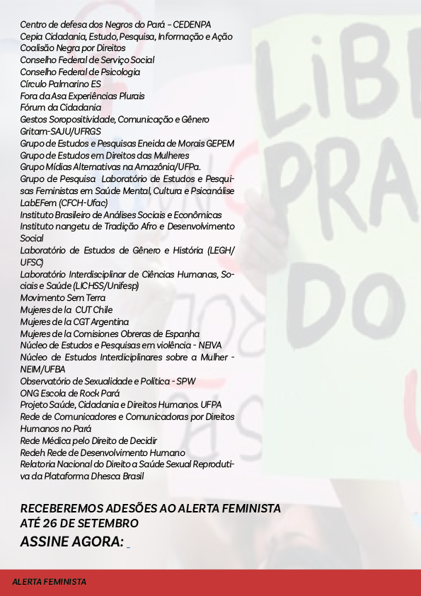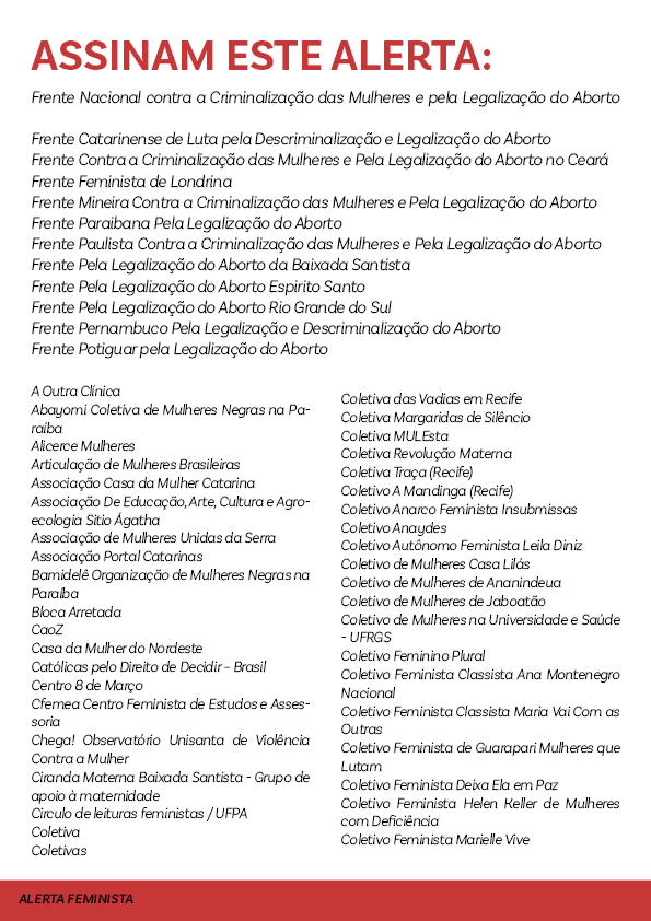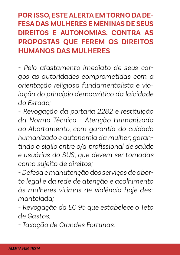 Aberto para adesões de coletivos, grupos, organizações, redes, movimentos e até mesmo iniciativas individuais, o ALERTA FEMINISTA de 2020 denuncia pacto reacionário para destruir os serviços de aborto legal que atendem no SUS as mulheres e meninas vítimas de violência. ASSINE!