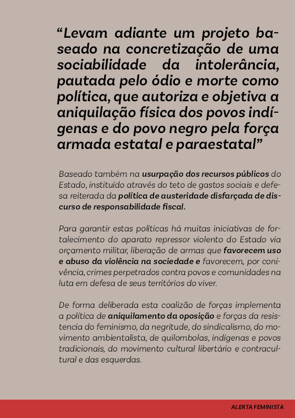 Lançamos este ALERTA sobre a presente ofensiva neoliberal fundamentalista que aprofunda o patriarcado racista, aqui instalado desde a colonização!