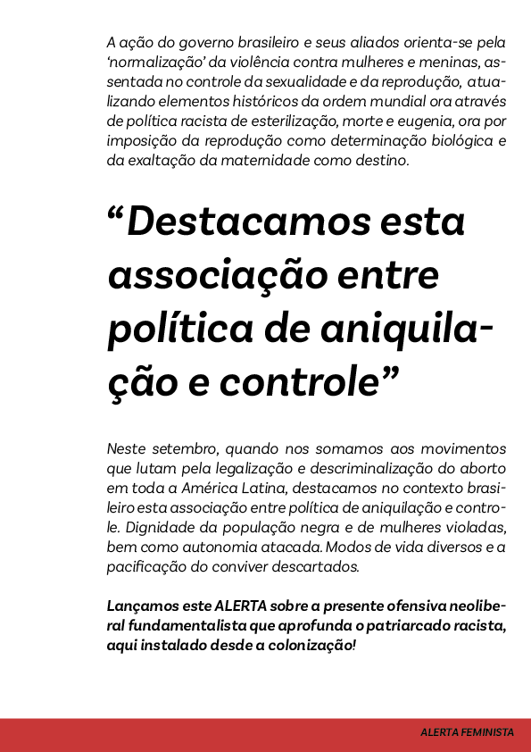 Neste setembro, quando nos somamos aos movimentos que lutam pela legalização e descriminalização do aborto em toda a América Latina, destacamos no contexto brasileiro esta associação entre política de aniquilação e controle. Dignidade da população negra e de mulheres violadas, bem como autonomia atacada. Modos de vida diversos e a pacificação do conviver descartados.