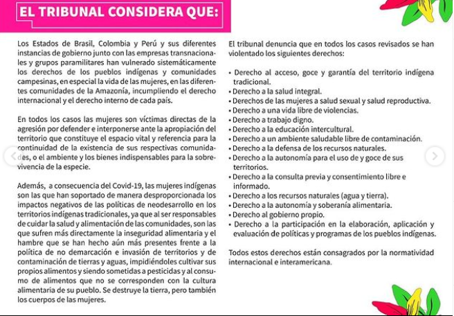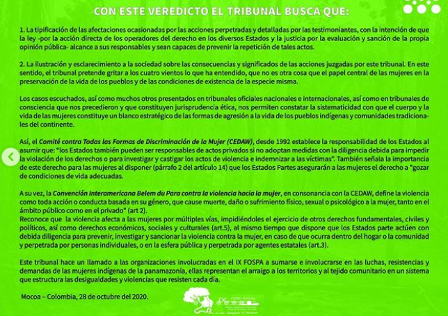 No marco de 8 de março, compartilhamos a sentença do II Tribunal de Justiça e Direitos das Mulheres Panamazônicas que no processo do IX FOSPA se pronunciou sobre as violações dos direitos das mulheres indígenas no Brasil, Colômbia e Peru exigem pronta ação dos Estados. A decisão mostra que os corpos das mulheres continuam sendo campos de batalha movidos pelo extrativismo e que em nossa ampla e rica diversidade estamos juntas na defesa de nossas autonomias por uma vida livre de violência.
