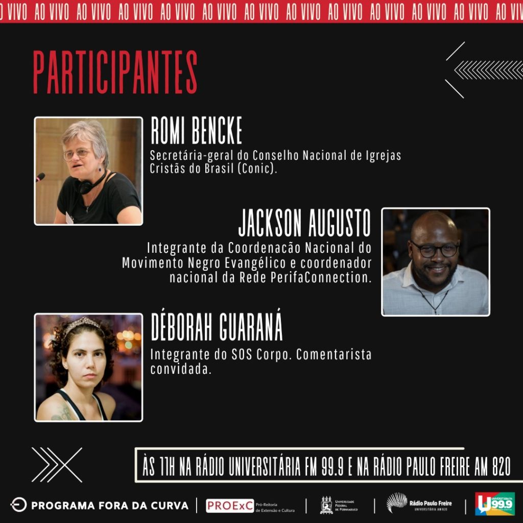 O programa conta com as as presenças de Romi Bencke, pastora luterana e Secretária-geral do Conselho Nacional de Igrejas Cristãs do Brasil, de Jackson Augusto, da Coordenação Nacional do Movimento Negro Evangélico, e de Déborah Guaraná, jornalista e integrante do SOSCorpo, como comentarista convidada.