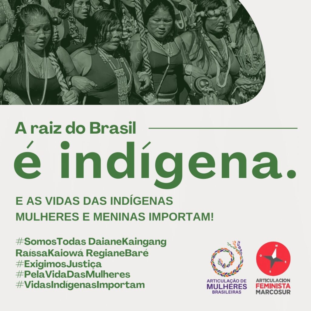 Nos somamos ao repúdio e à exigência por justiça bradada pela Articulação Nacional das Mulheres Indígenas Guerreiras da Ancestralidade (ANMIGA), pela Articulação dos Povos Indígenas do Brasil (APIB) e pelas diversas entidades das mulheres indígenas da América Latina e do Caribe, contra as bárbaras mortes de Daiane, Raissa e Regiane. Nos recusamos a aceitar que meninas e mulheres indígenas continuem tendo seus direitos retirados e suas vidas ceifadas, impunemente!