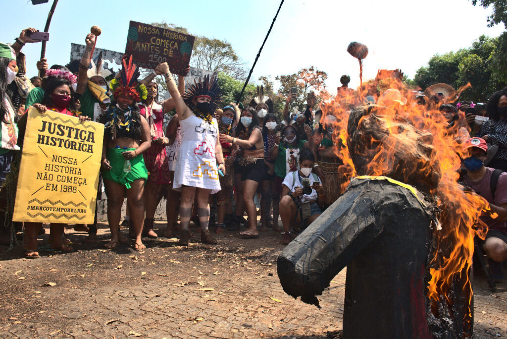A ideia inicial era que, no dia 8 de agosto, sairíamos em marcha até o Supremo Tribunal Federal (STF) para acompanhar a votação sobre o Marco Temporal. Com a tensão criada pelos bolsonaristas, mais uma vez foi necessário decidir por permanecer no acampamento, acompanhando de lá a votação.