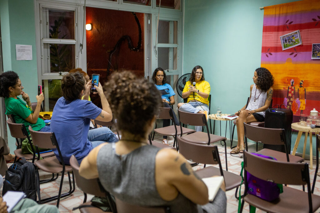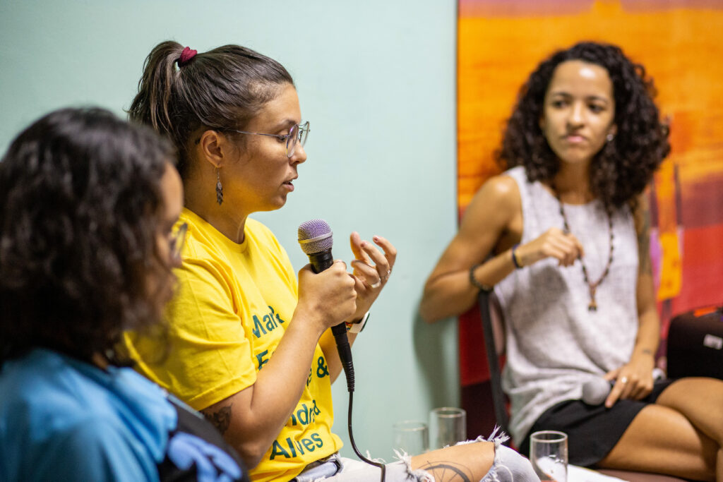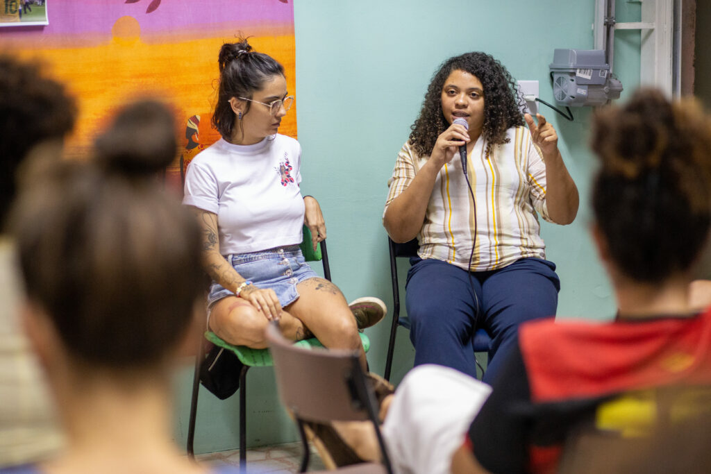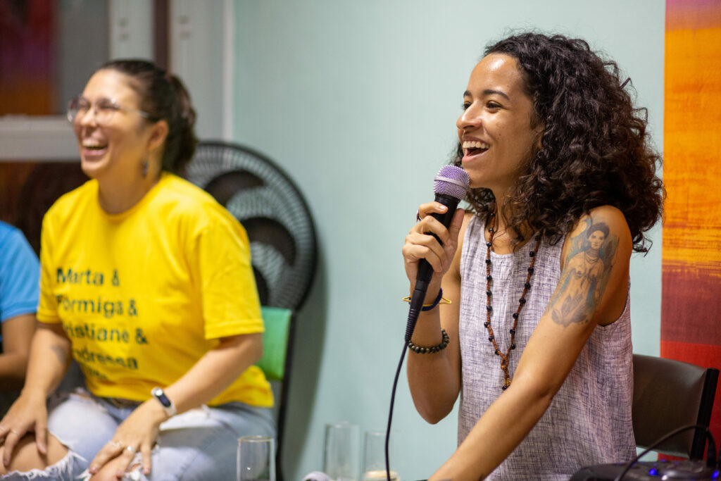 As convidadas compartilharam como foi a aproximação de cada um com o universo do futebol, algumas desde crianças, quando jogavam em quadras e campinhos de várzea, dividindo bolas e enfrentando os meninos, ou quando suas primeiras lembranças são das idas aos estádios de futebol com pais e familiares ou ainda, já adultas, quando se depararam com a potência do futebol como meio de fortalecimento de comunidades. O comum das experiências foi o entendimento de que o que as milhares de meninas e mulheres fazem no futebol cotidianamente, são processos revolucionários.