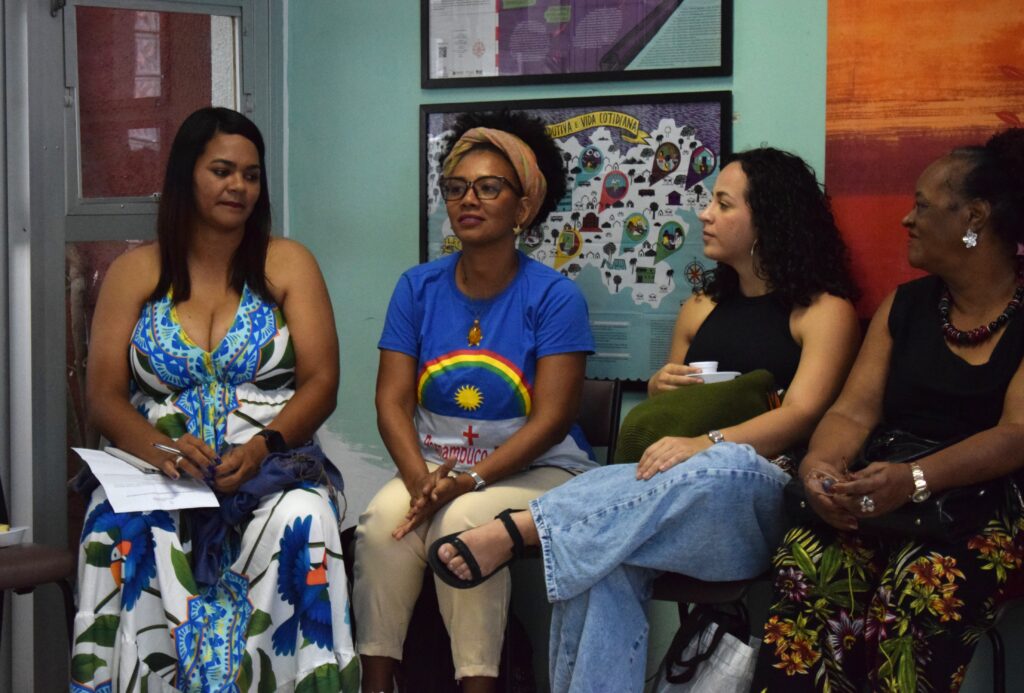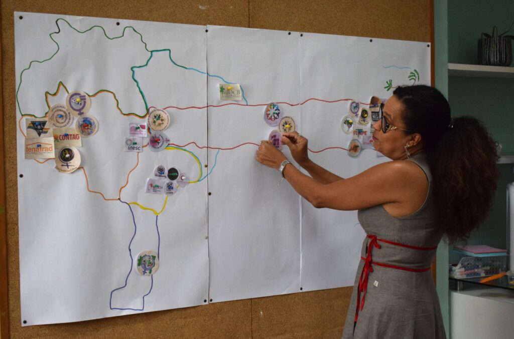 Com um mapa do Brasil e de Pernambuco no quadro, a coordenação do SOS Corpo, que mediou a roda de conversa “nós e nossas lutas”, conduziu uma visualização para que Zélia pudesse entender um pouco mais sobre onde se localizam as atuações e quais as lutas que cada movimento e organizações presentes fazem em seus territórios.