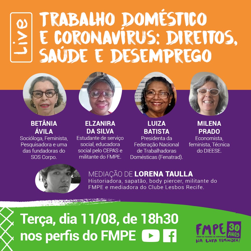 Para discutir a realidade das trabalhadoras, o FMPE convida: Elzanira Da Silva Estudante de serviço social, educadora social pelo CEPAS e militante do FMPE; Betânia Ávila Socióloga, feminista, pesquisadora e uma das fundadoras do SOS Corpo; Luiza Batista Presidenta da Federação Nacional de Trabalhadoras Domésticas (Fenatrad); e Milena Prado Economista, feminista, técnica do DIEESE.