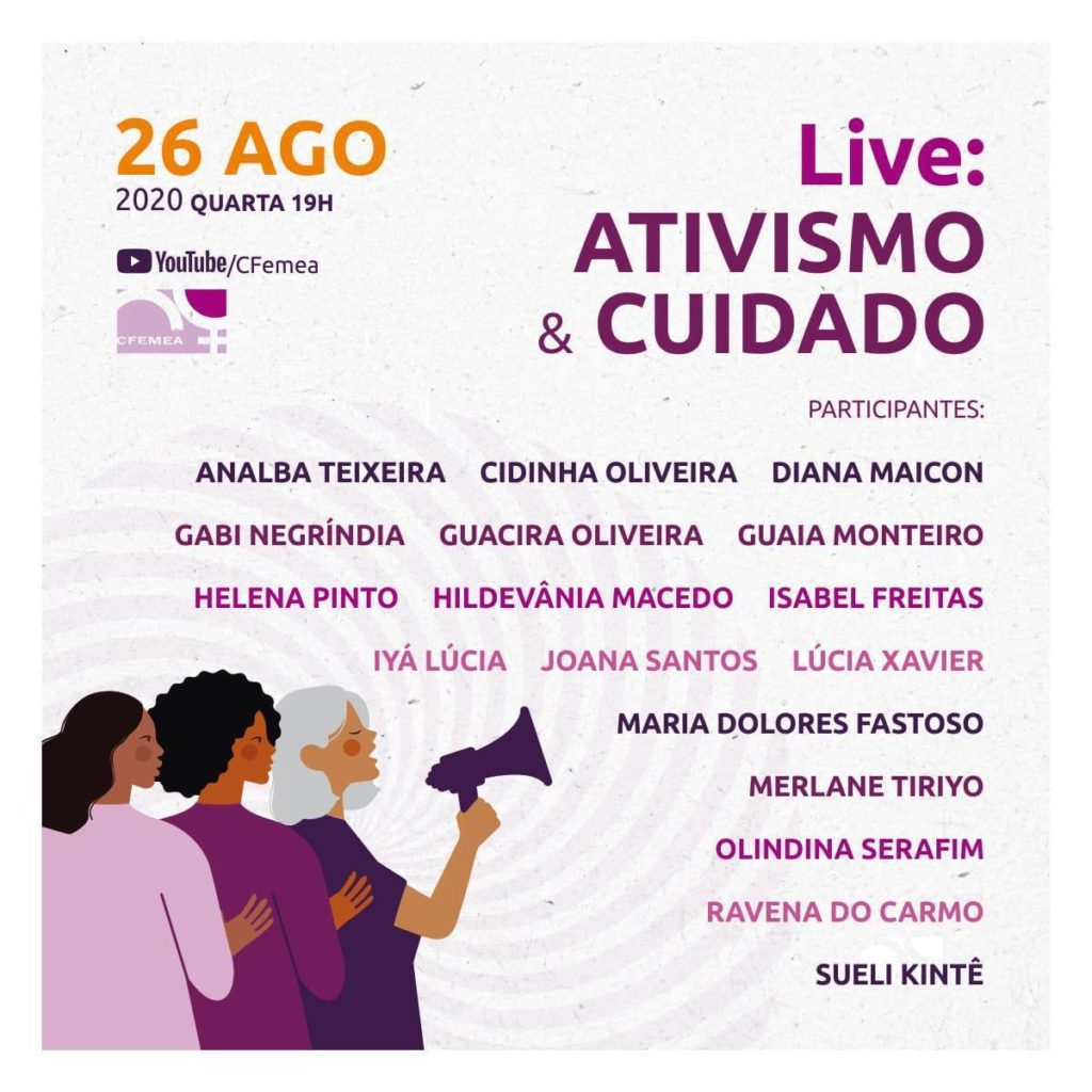 Acontece nesta quarta-feira (26), às 19h, a live Ativismo e Cuidado, do Centro Feminista de Estudos e Assessoria. A transmissão, que será feita pelos canais do CFEMEA no Facebook e no Youtube, contará com convidadas muito especiais participando em três blocos. Confira!