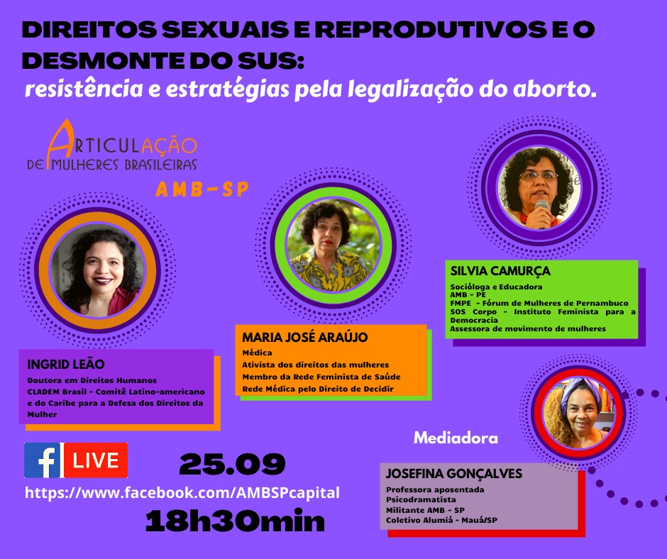 Para discutir o tema DIREITOS SEXUAIS E REPRODUTIVOS E O DESMONTE DO SUS: resistência e estratégias pela legalização do aborto, a AMB/SP convidou integrantes de organizações que são signatárias do Alerta Feminista 2020, documento elaborado por diversas organizações feministas e de luta pela legalização e contra a criminalização das mulheres, denuncia o avanço do pacto conservador com o objetivo da total criminalização do aborto no país.