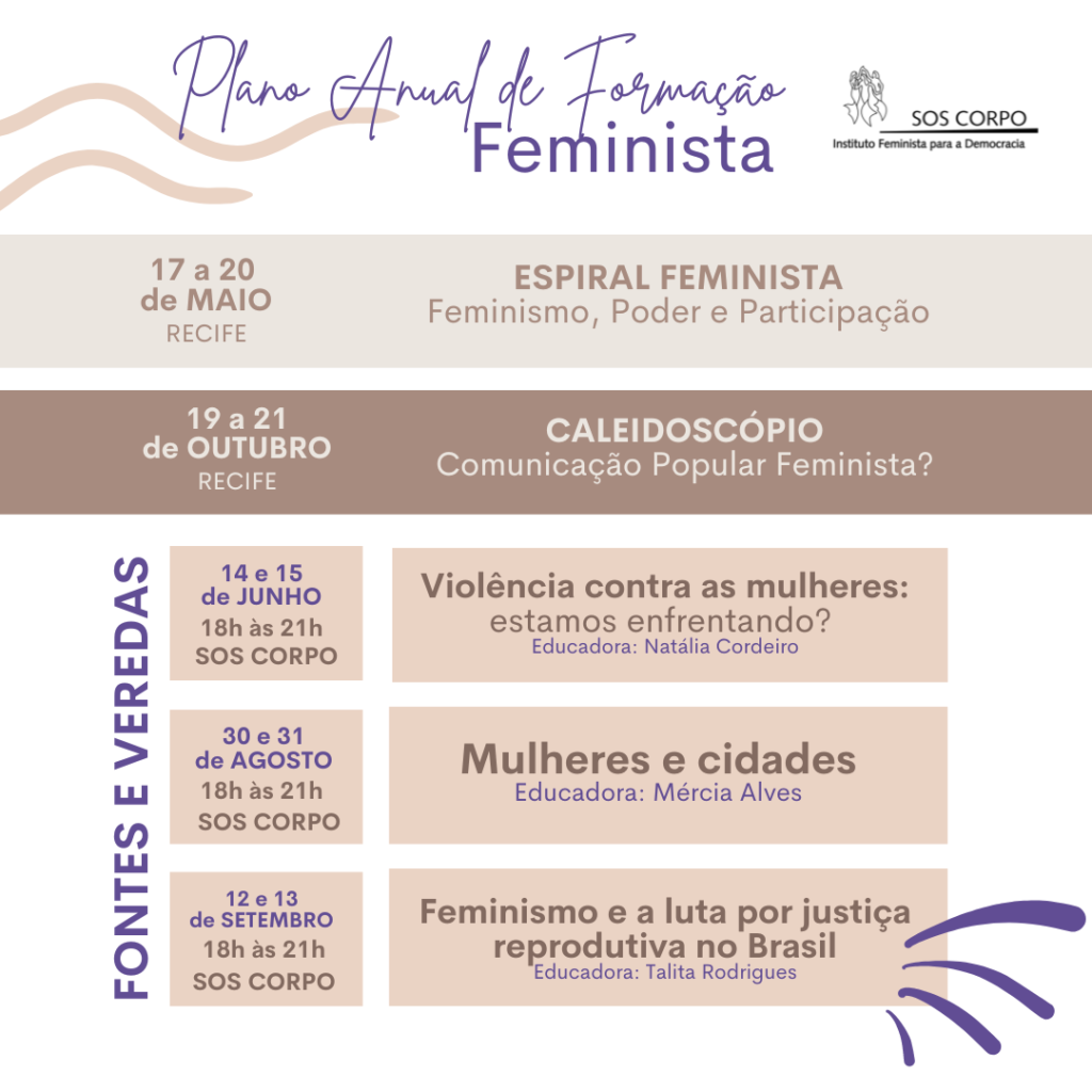 O curso Espiral Feminista do SOS Corpo em 2023 terá o tema Feminismo, Poder e Participação Política. Ele reunirá militantes de movimentos feministas e outros movimentos sociais para refletir sobre os dilemas da participação social na experiência brasileira, considerando tanto a participação autônoma como institucional. Traremos reflexões sobre o sistema político, incluindo instrumentos de democracia representativa e direta; comunicação e judiciário; a história recente da participação tendo como marco a Constituinte; os processos institucionais de participação lidos a partir da crítica feministas; o debate sobre movimentos sociais e a incidência em políticas públicas para conquista de direitos. É uma oportunidade para problematizar o direito à participação em nosso país, intercambiar experiências e concepções de distintos movimentos sociais e debater os desafios da nova conjuntura que se abriu com o advento do governo Lula para nós que construímos as lutas populares.