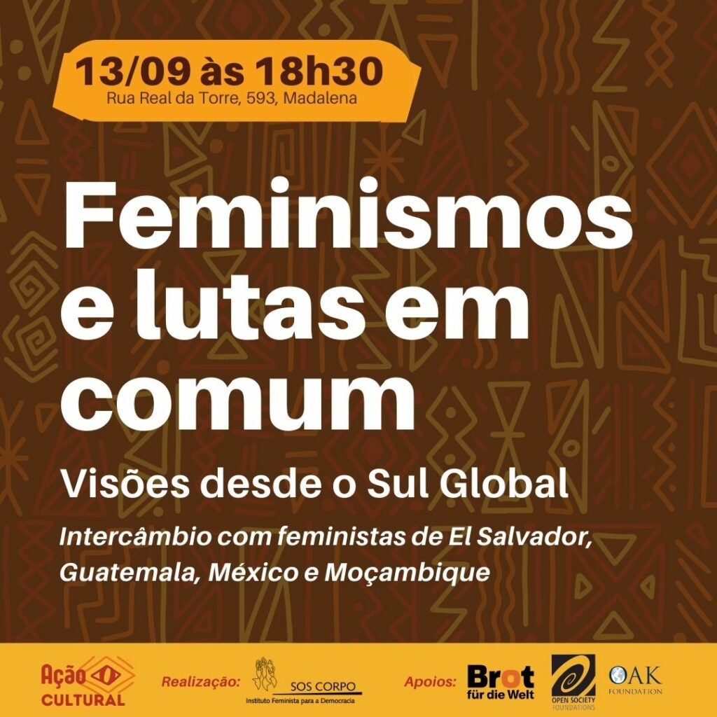 📣 Na próxima quarta-feira, 13 de setembro, o SOS Corpo realiza mais uma Ação Cultural Feminista aberta ao público. Com o tema Feminismos e Lutas em Comum – visões desde o Sul Global, vamos receber companheiras de El Salvador, Guatemala, Moçambique e México para um intercâmbio de perspectivas e experiências a partir destes territórios.