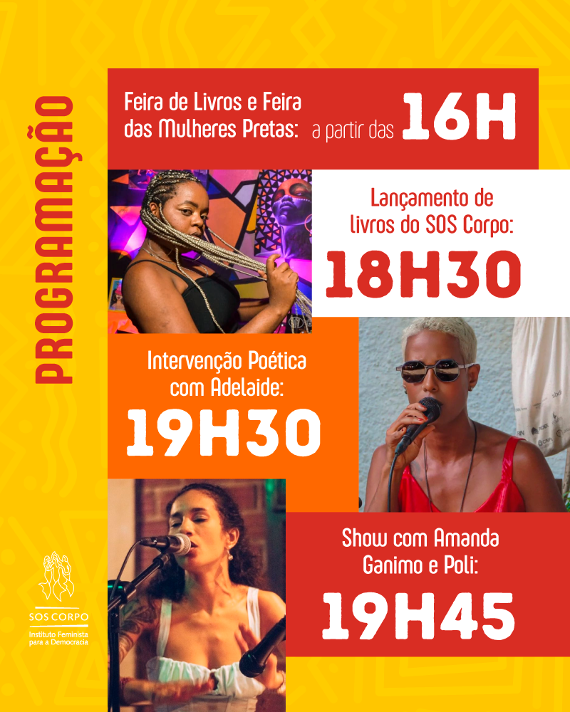 Às 18h30 vamos contar com a presença de pesquisadoras e educadoras do SOS Corpo, que lançaram ao longo do ano publicações sobre temas-causas que movem os trabalhos do Instituto. Trabalho remunerado e a luta das trabalhadoras domésticas pela garantia de direitos; mortalidade materna e o racismo na saúde;, e a situação das políticas de enfrentamento à violência contra as mulheres na cidade do Recife, em especial na Delegacia Especializada em Atendimento à Mulher, são algumas dessas temáticas.