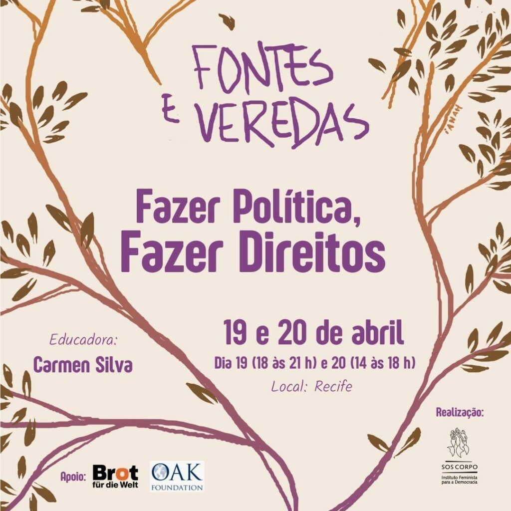 O Fontes e Veredas é uma atividade educativa em que nós do SOS Corpo compartilhamos nossas referências e percursos, promovendo diálogos. As inscrições serão realizadas mediante preenchimento de formulário eletrônico (clique aqui para se inscrever) e ficarão abertas no período de 05 a 11 de abril. As selecionadas serão contatadas por mensagem no whatsapp no dia 12 de abril. O curso será realizado na cidade de Recife em local a ser divulgado para as selecionadas.