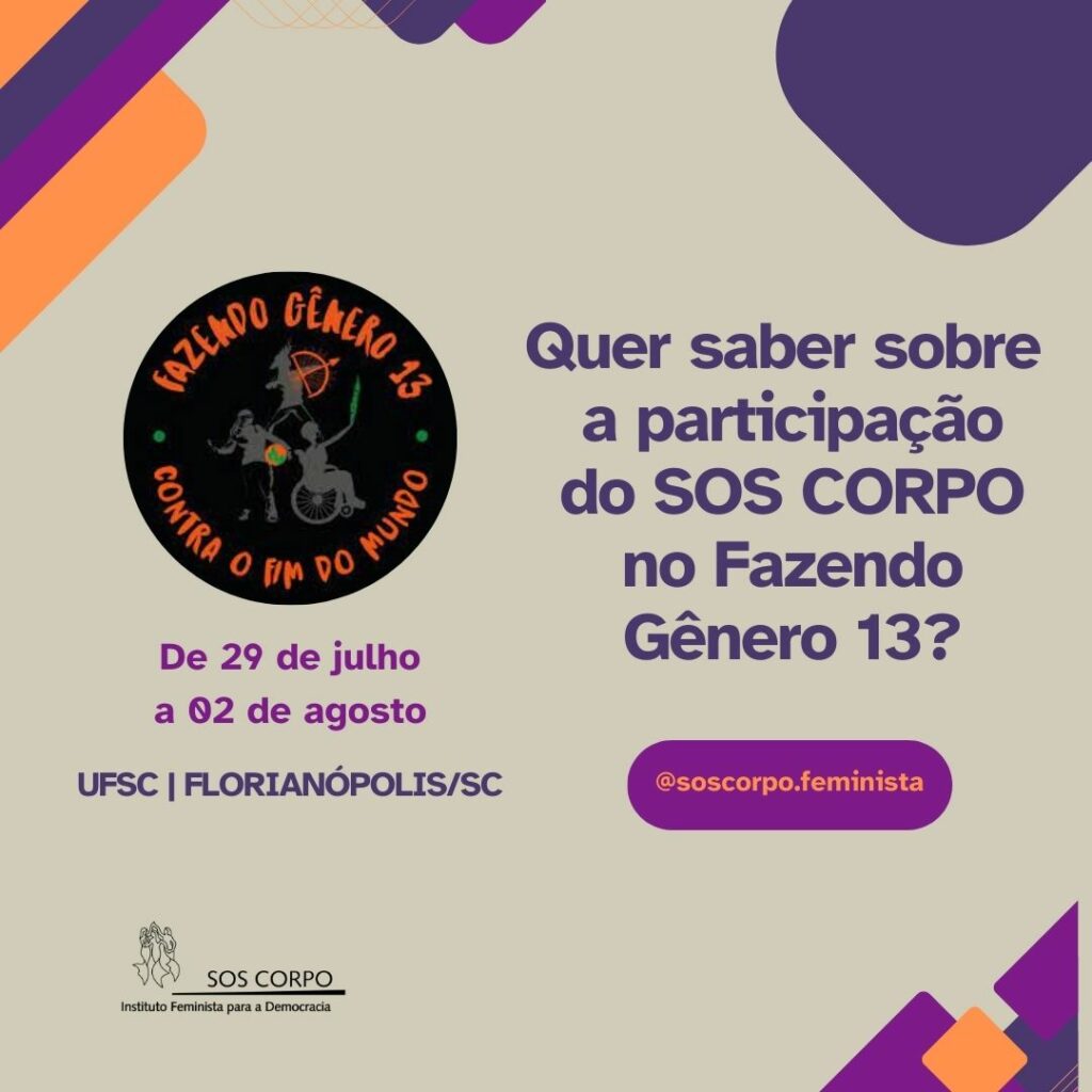 Entre os dias 29 de julho a 02 de agosto deste ano, acontece a 13ª edição do Seminário Internacional Fazendo Gênero, na cidade de Florianópolis, em Santa Catarina. O SOS Corpo Instituto Feminista para a Democracia participa de atividades presenciais e online na programação.