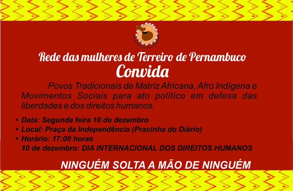 Rede das Mulheres de Terreiro de Pernambuco convida povos tradicionais de matriz africana, afro indígenas, movimentos sociais e todos e todas para o ato político em defesa das liberdades e dos direitos humanos. O acontecerá no Dia Internacional dos Direitos Humanos, segunda-feira (10) na pracinha do Diário (Praça da Independência, Santo Antonio – Recife) a partir das 17 horas.