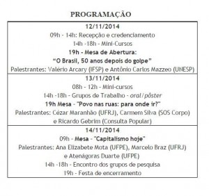 Segue até a próxima sexta-feira (14) o 6º Encontro de Grupos de Estudos e Pesquisas Marxistas (EPMARX). O tema este ano é “O Brasil 50 anos depois do Golpe: 1964-2014” e a programação inclui apresentações de trabalhos e minicursos. O encontro acontece no Centro de Educação da UFPE e está aberto à participação de organizações políticas, integrantes de movimentos sociais e demais interessados nos estudos marxistas. Outras informações estão no blog: http://gepmarx.blogspot.com.br/