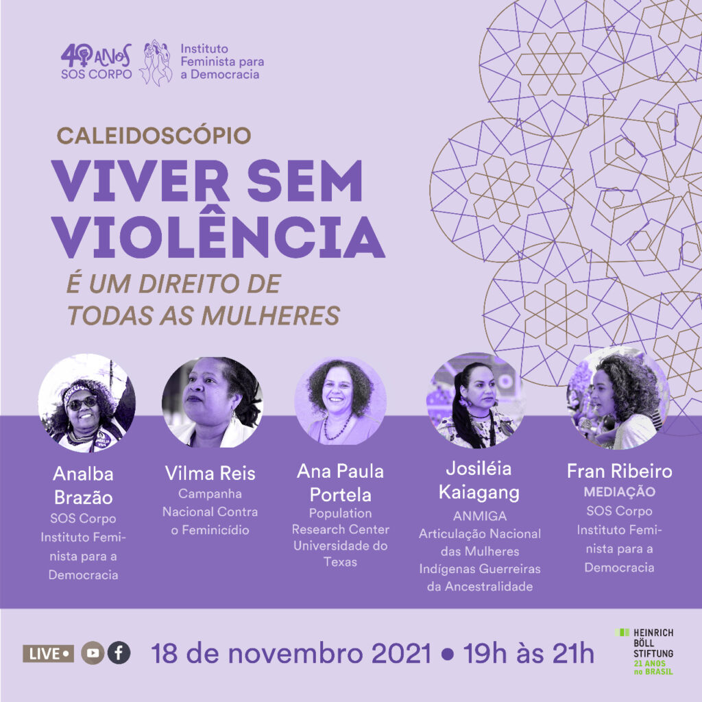 Na próxima quinta-feira, dia 18 de novembro, acontece a live de abertura do Curso Caleidoscópio 2021, que nesta edição traz como tema central a violência contra as mulheres. A transmissão ao vivo será das 19h às 21h, no canal do SOS Corpo no youtube e pelo perfil do Instituto no facebook. A transmissão terá acessibilidade em libras.