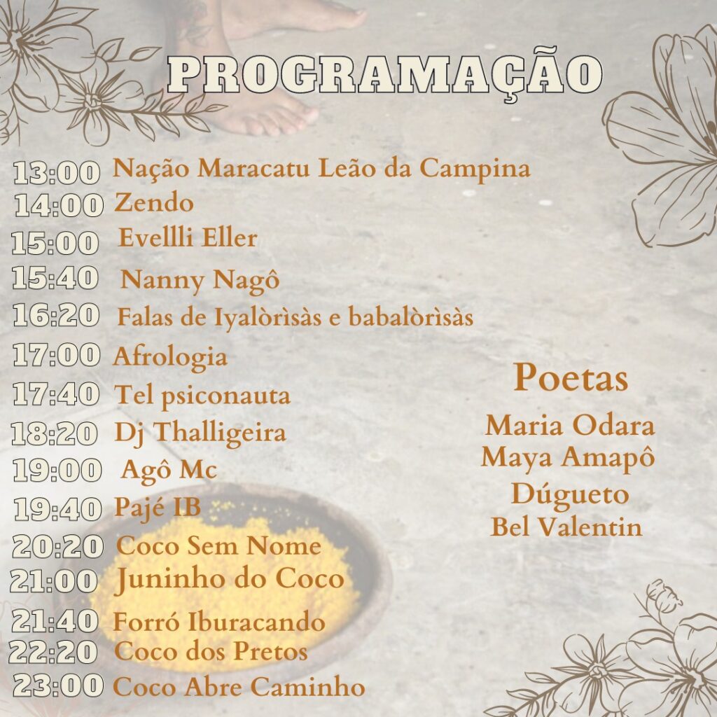 A programação, marcada para iniciar às 13h, conta com apresentações artísticas e culturais, além da realização de um debate, que tem o objetivo de celebrar a ancestralidade e difundir o conhecimento identitário sobre as religiões e as tradições culturais de matriz africana. Já estão confirmadas as presenças de diversas poetas, artistas e grupos, como Nação Maracatu Leão da Campina, Afrologia, DJ Thalligeira, Coco Sem Nome, Forró Iburacando, Coco Abre Caminho, Maya Amapô entre outras atrações que você pode conferir abaixo: