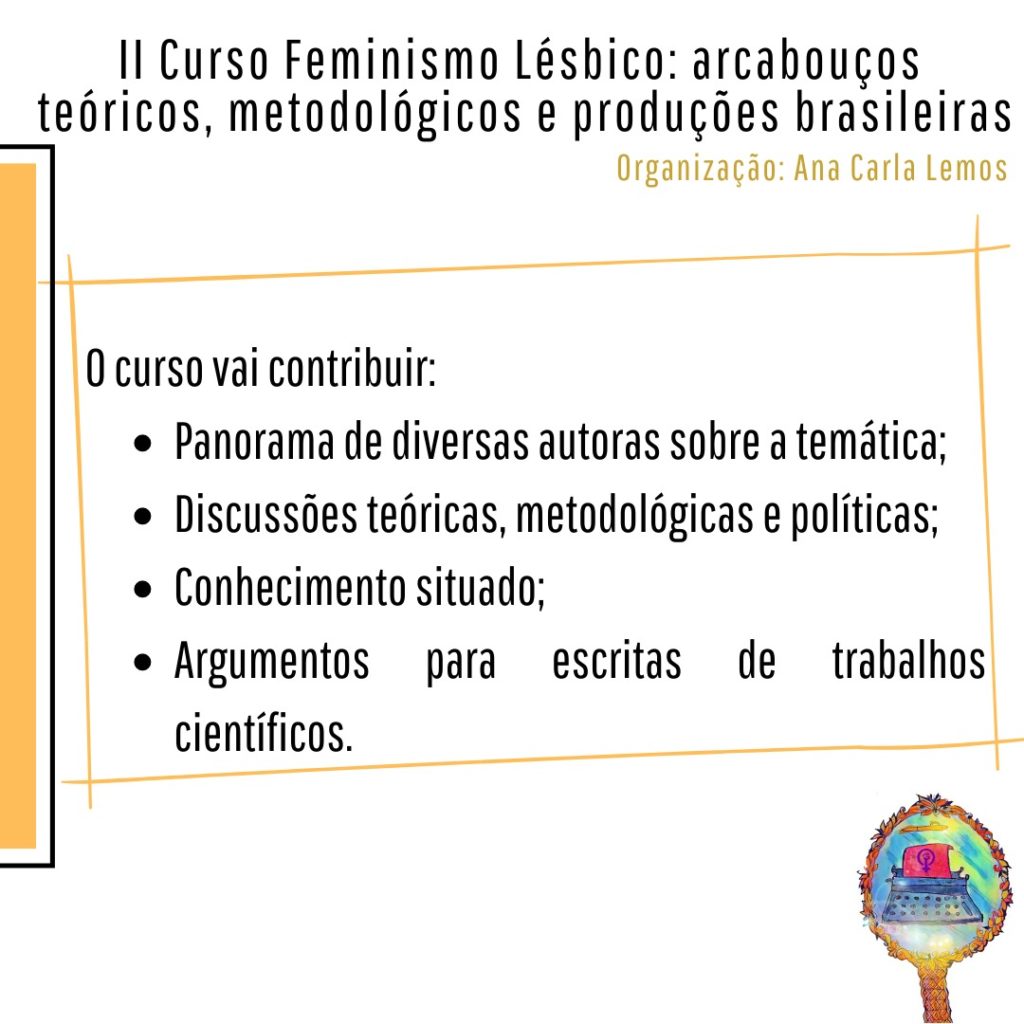 Com um total de 42h aula, o curso amplia o arcabouço teórico e metodológico sobre os diálogos entre o Feminismo Lésbico e as interseccionalidades vista na primeira edição, aprofundando as reflexões sobre a heteronormatividade como um sistema de controle patriarcal, a partir das contribuições de intelectuais lésbicas brasileiras.