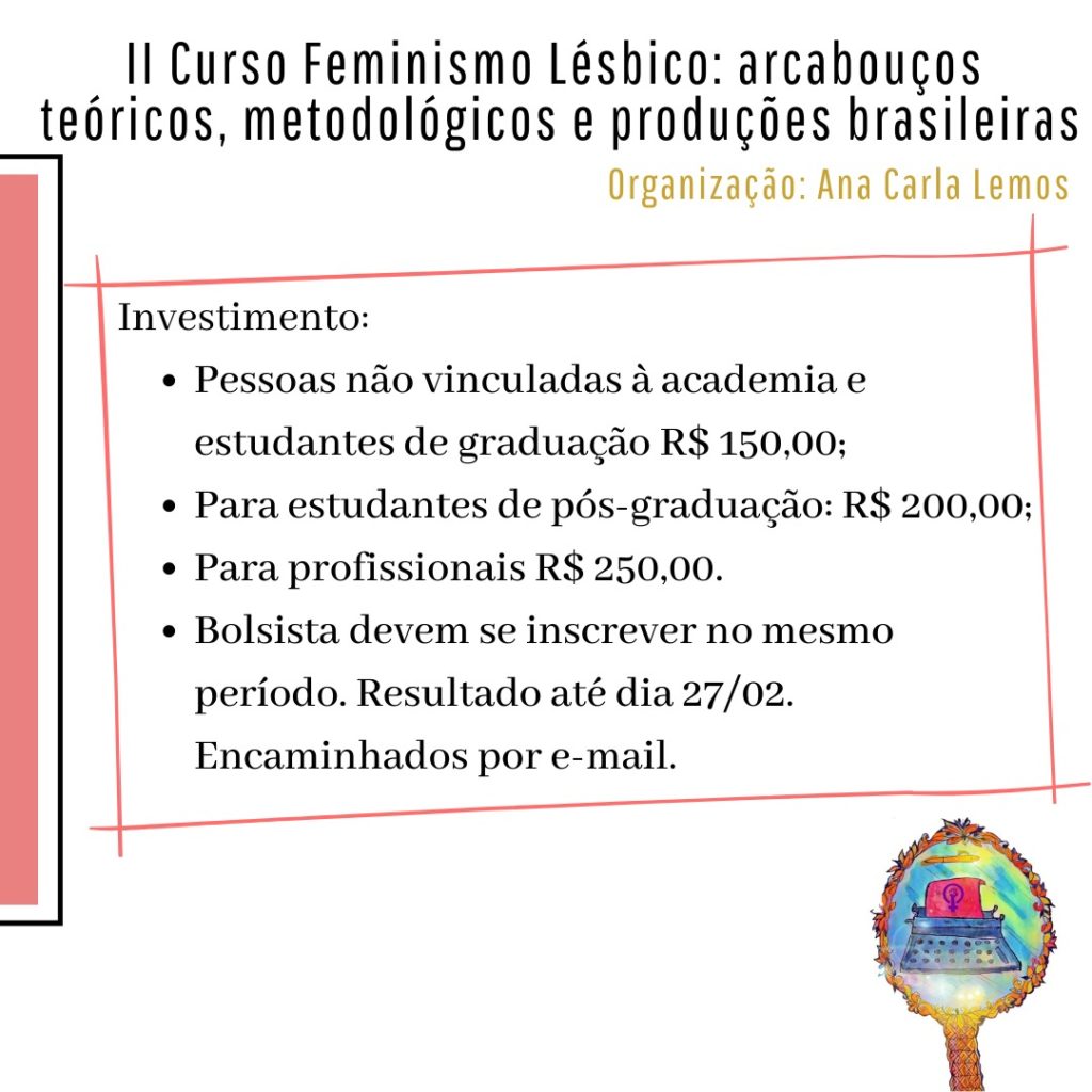 Organizado pela pesquisadora e ativista lésbica Ana Carla Lemos, o II Curso Feminismo Lésbico: arcabouços teóricos, metodológicos e produções brasileiras está com inscrições abertas até o dia 25/02 . Com a participação de docentes convidadas, a segunda parte do Curso começa dia 01 de março e terá aulas semanais até dia 31 de maio.
