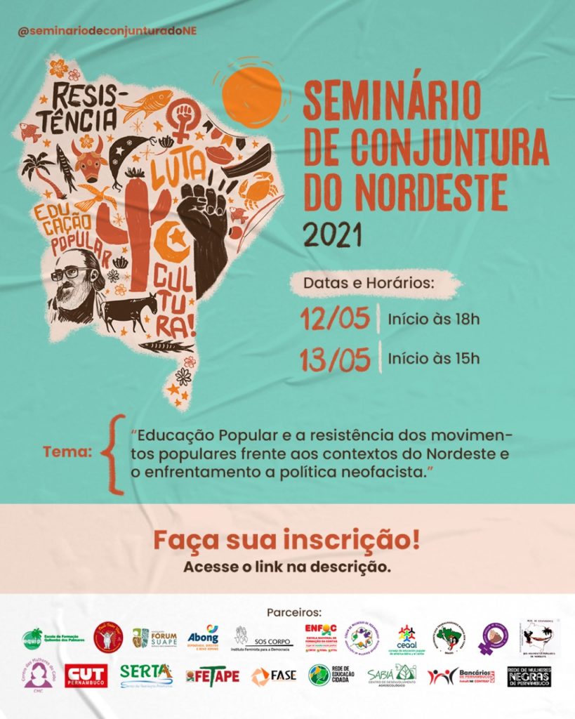 O Seminário de Análise de Conjuntura Política do Nordeste de 2021 acontece nos dias 12 e 13 de maio, em formato virtual, para dialogar sobre a Educação Popular e a resistência dos movimentos sociais frente aos contextos do Nordeste e o enfrentamento à política neofascista. A proposta do evento é construir um posicionamento político unitário dos movimentos sociais do Nordeste, no tocante ao desmonte das políticas públicas e contra a postura genocida do Governo Federal em relação à pandemia e a perseguição aos defensores/as dos direitos humanos.