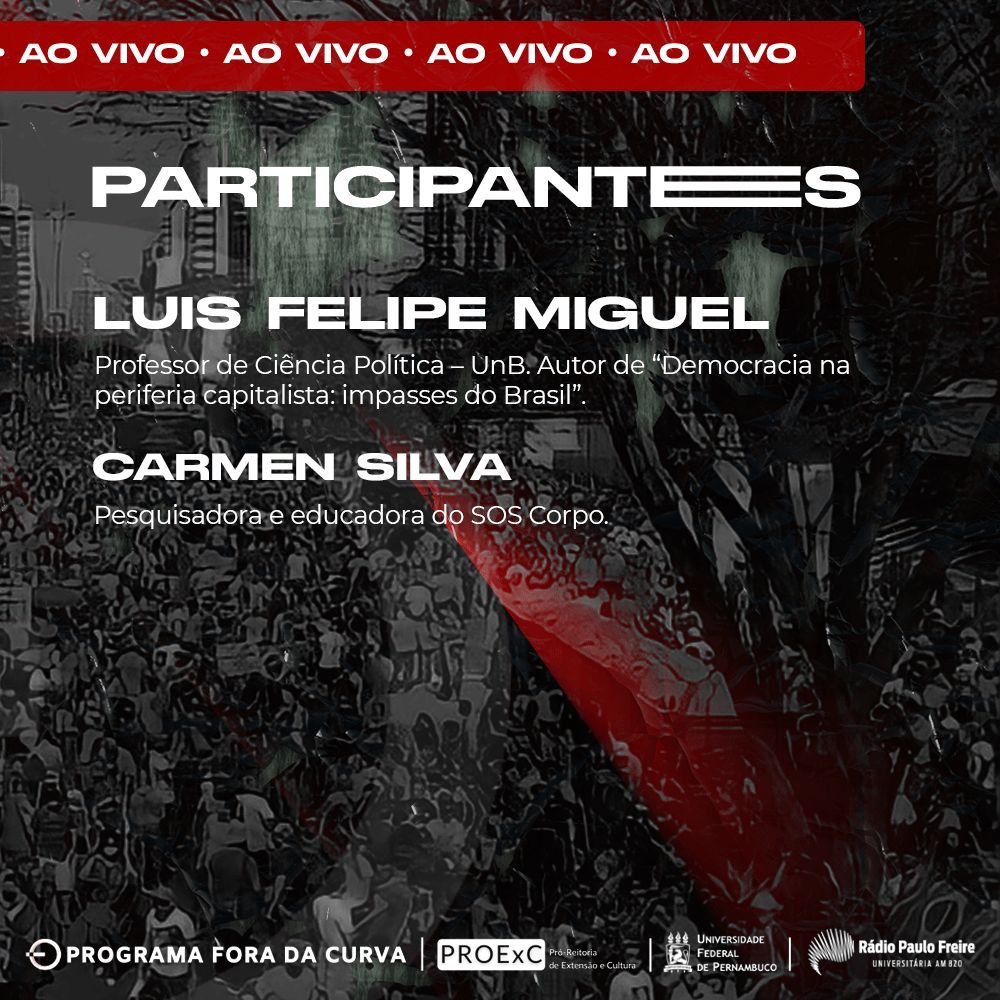 Além de Carmen Silva, o Fora da Curva também convidou para o debate, Luis Felipe Miguel, professor de Ciência Política da UnB e autor do livro “Democracia na periferia capitalista: impasses do Brasil”. Carmen e Miguel, junto com a professora e apresentadora do Programa, Maria Eduarda buscam entender a pergunta: quem ganha quando a democracia perde?