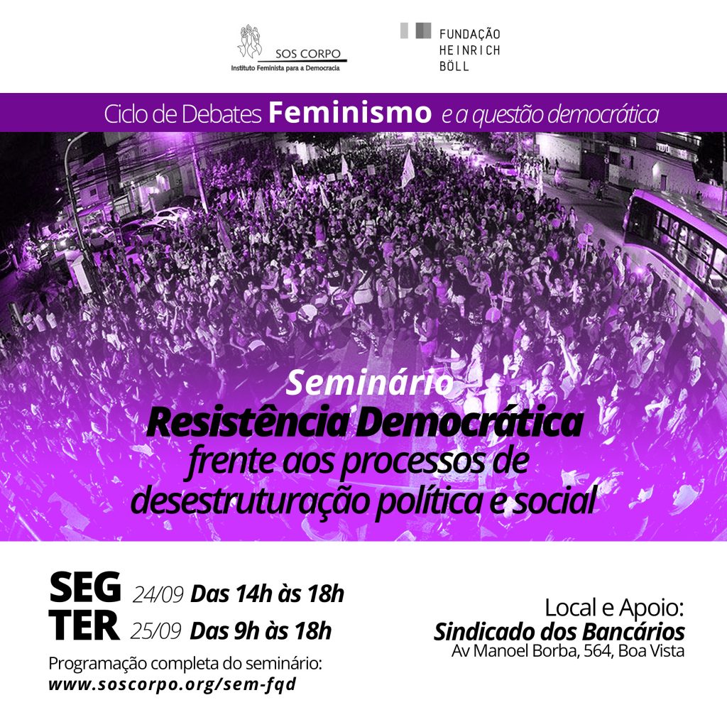 Entre os dias 24 e 25 de setembro o SOS Corpo e a Fundação Henrich Boll promovem o segundo evento de um ciclo de debates sobre Feminismo e a Questão Democrática, tratando especificamente da Resistência democrática frente aos processos de desestruturação política e social. O seminário é gratuito, aberto ao público e será realizados com o apoio do Sindicato dos Bancários, que acolhe a realização do evento, na Boa Vista, região central do Recife. Baixe aqui ou confira abaixo a programação completa: