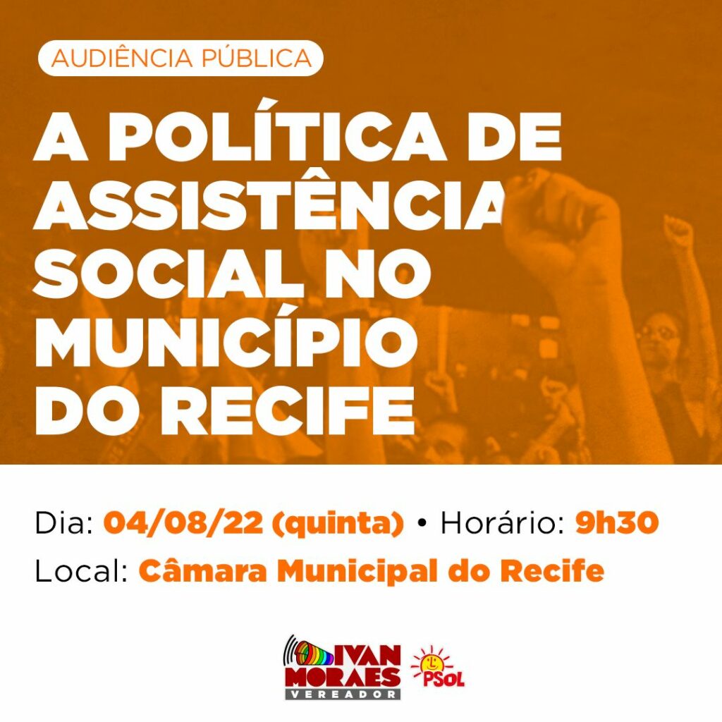 Nesta quinta-feira, 04 de agosto, trabalhadoras e trabalhadores, pessoas usuárias do Sistema Único de Assistência Social (SUAS) e população em geral vão poder participar da discussão proposta pelo vereador Ivan Moraes (PSOL) na Câmara de Vereadores da Cidade do Recife. A Audiência Pública marcada para começar às 9h30 tem o objetivo de debater sobre a política de assistência social no município e evidenciar um diagnóstico sobre a situação dos serviços dos centros referenciados e das redes de assistência na cidade.