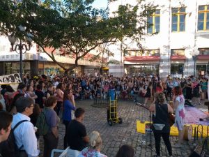 Florianópolis Ativistas reuniram-se em ato contra a PEC 181 no centro de Florianópolis. A concentração acontece na recém inaugurada Esquina Feminista (entre as ruas Deodoro da Fonseca e Conselheiro Mafra). O panfleto divulgado ressalta que não podemos deixar que essa PEC 181 seja aprovada. “Ela é uma fraude que, baseada no discurso religioso, atenta contra o direito, liberdade e autonomia das mulheres! A vida de um embrião não pode ser mais importante que a vida de uma mulher adulta e nenhuma mulher deve ser obrigada a prosseguir com uma gestação indesejada, fruto de uma relação violenta e não consentida. Proibir o aborto legal é condenar muitas mulheres ao sofrimento e à morte”